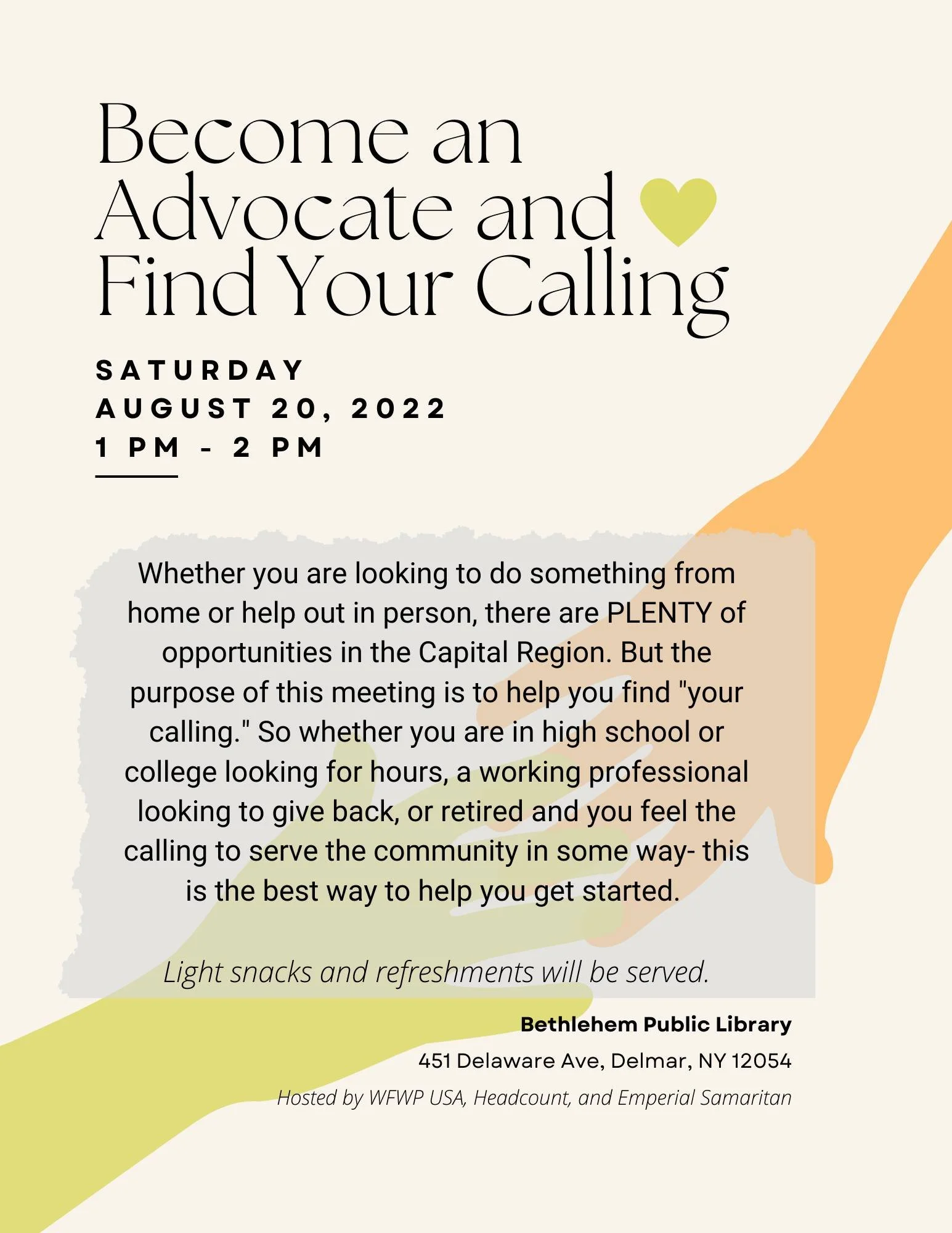 Become an Advocate and Find Your Calling Saturday, August 20, 2022 1:00 PM 2:00 PM Bethlehem Public Library 451 Delaware Avenue Delmar, NY, 12054 United States (map) Google Calendar ICS