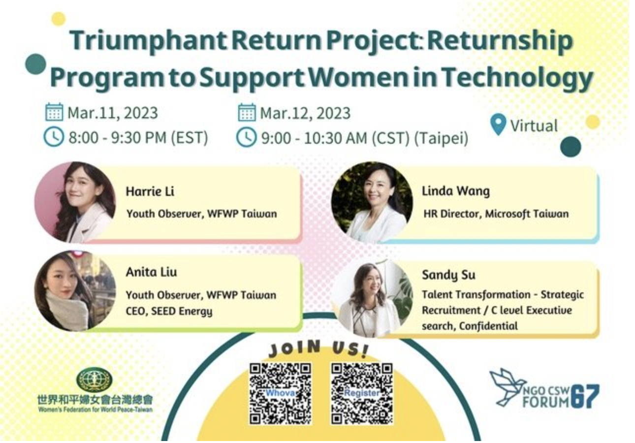 A virtual NGO CSW67 Forum Parallel Event, organized by WFWP Taiwan and Global Women Entrepreneurs’ Peace Alliance, will be held on Saturday, March 11, 2023 on the theme, “Triumphant Return Project: Returnship Program to Support Women in Technology.”