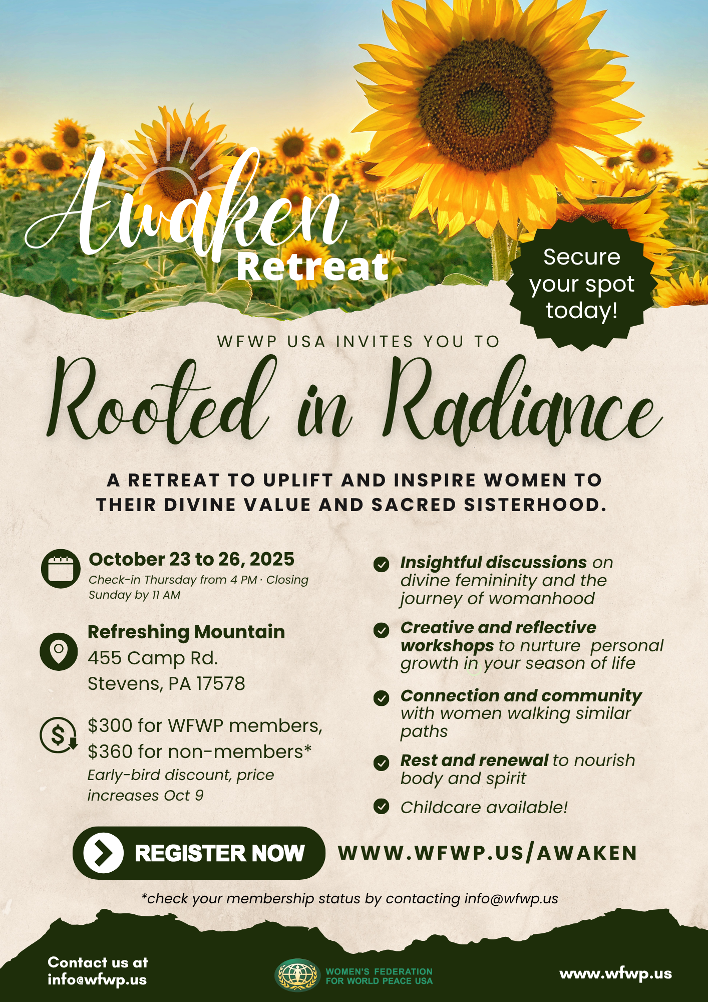 We invite women of all ages to participate in this year's Awaken Retreat: Rooted in Radiance, hosted by Women's Federation for World Peace, USA (WFWP). This retreat is intended to be a space where women can be reinvigorated in their divine power and positive contribution towards one another, their families and their communities.