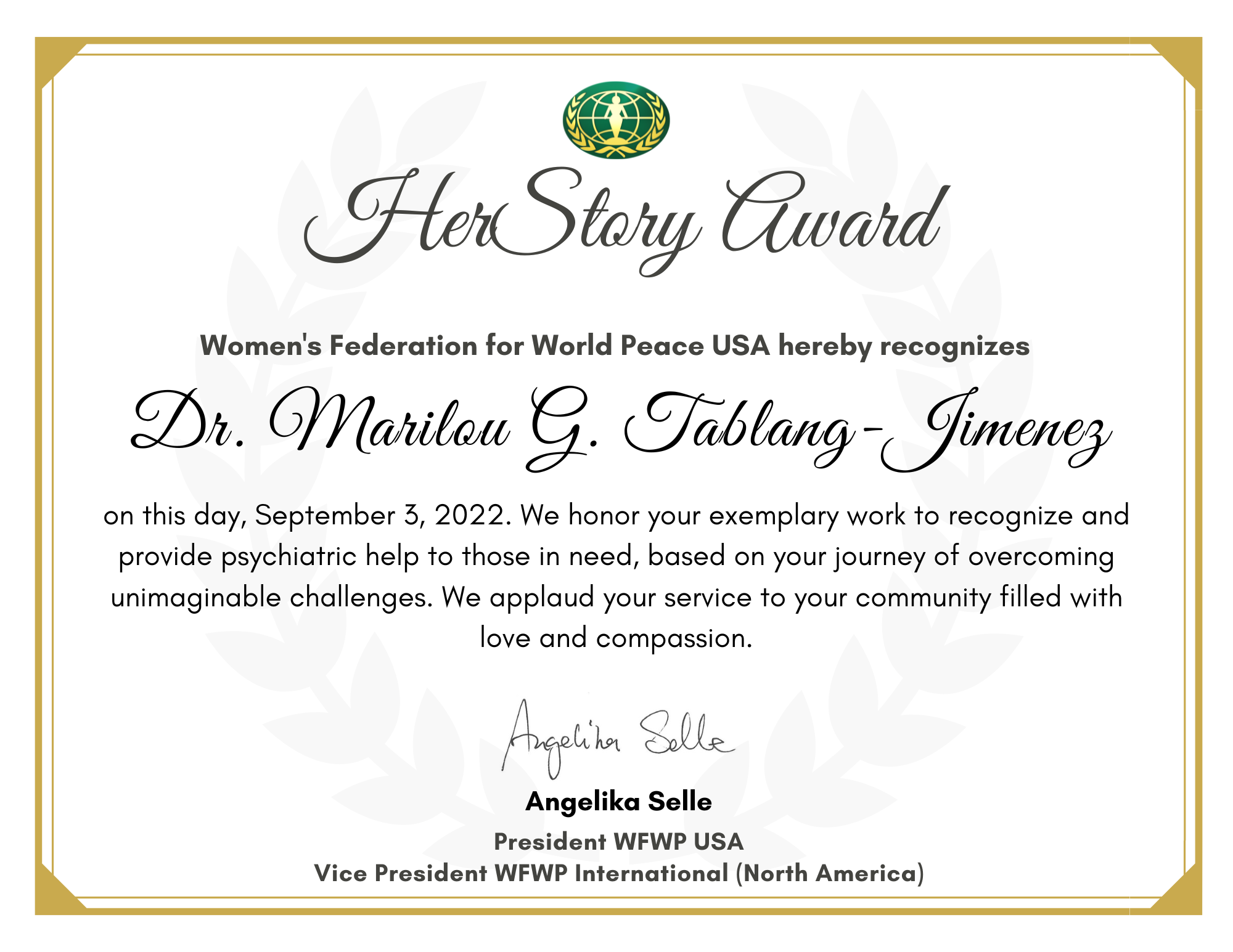 Dr. Marilou Tablang-Jimenez was honored on September 3, 2022, for her exemplary work to recognize and provide psychiatric help to those in need, based on her journey of overcoming unimaginable challenges. We applaud your service to your community filled with love and compassion.