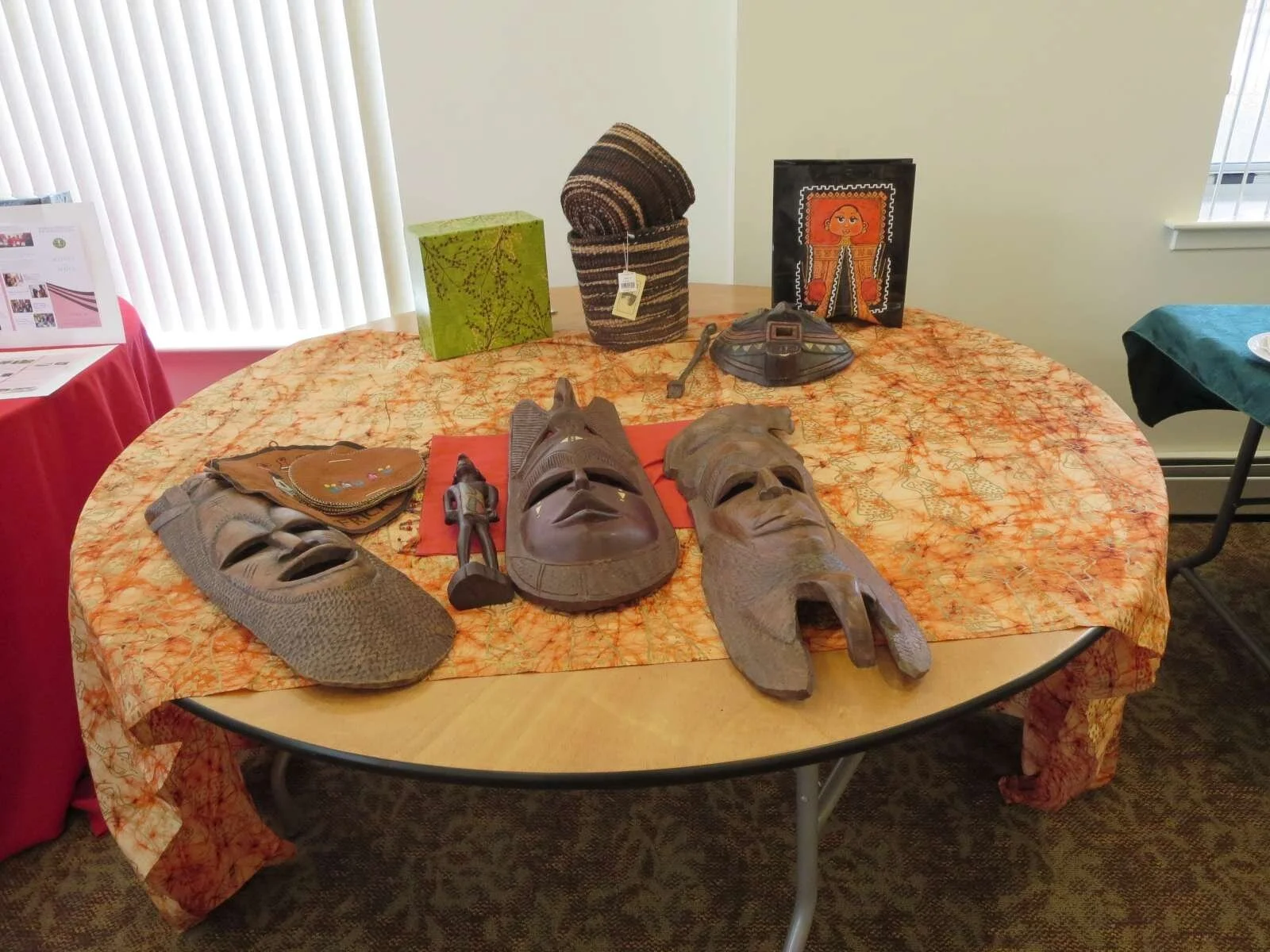 While planning this event, everyone agreed to expand all aspects of the table gathering to include our African families in the Schools of Africa program (SOA) that WFWP has supported for over 20 years now. Consequently, as a fundraiser for SOA, two tables were decorated with beautiful large African masks, necklaces and earrings, bracelets, baskets, dolls, and beautiful figurines for sale. Guests were eager to ask questions about the pamphlets, literature, and memberships available.