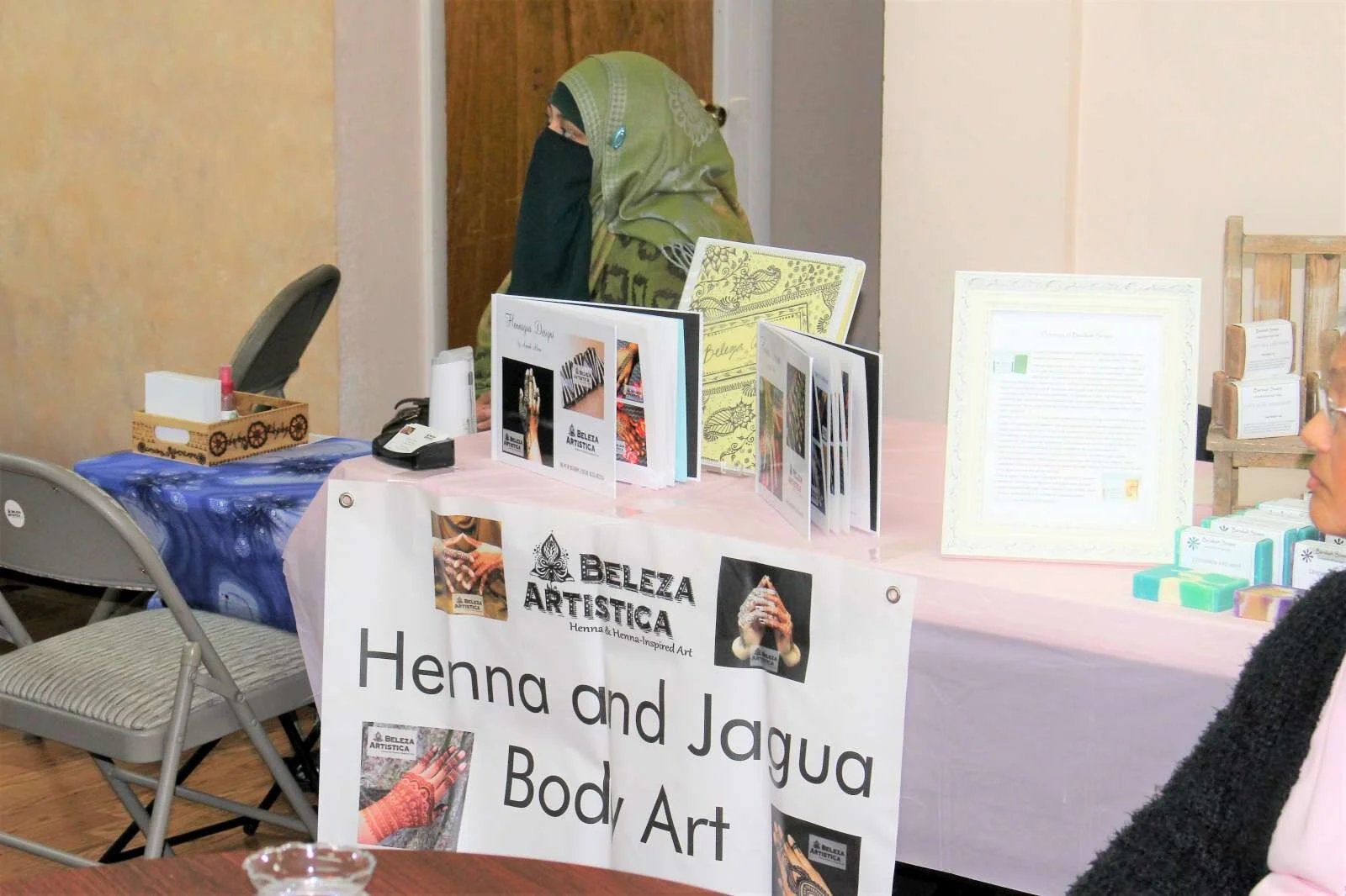 Pretty scarves, bars of handmade soap, intricate henna designs on one's hand, relaxing neck and shoulder massages ,a hearty buffet; all were purchased and enjoyed by most everyone present. Breaking bread together around small clusters of tables enabled us to all get to know each other a little bit better.