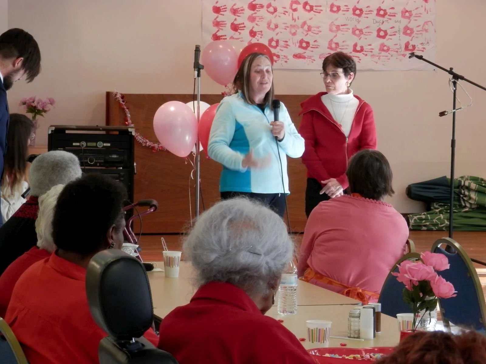 The event began with the Lake Ridge Fellowship House providing a chili lunch for the residents. In addition, the WFWP members brought additional chili, side dishes, snacks, and desserts to add a little extra flavor to the afternoon. The room had been tastefully decorated with balloons, flowers, and candy with a Valentine’s Day theme. Carmella Ciemny began the talent show by wishing everyone a “Happy Valentine’s Day”. Her daughter Phoebe, a Creative Writing major at George Mason University was introduced and took over as the emcee for the event. Lively performances included singing, dancing, piano playing, guitar playing, harmonica playing, storytelling, and poetry reading. During the show and in between the acts, there was an ongoing raffle and small Valentine’s gifts were raffled off.